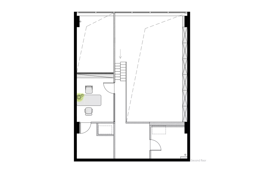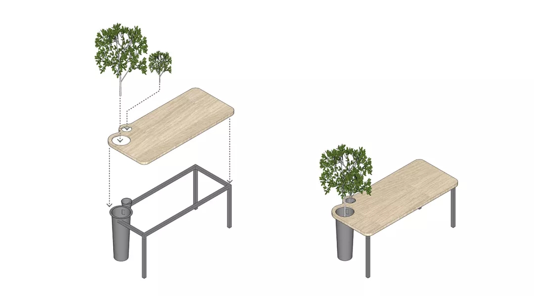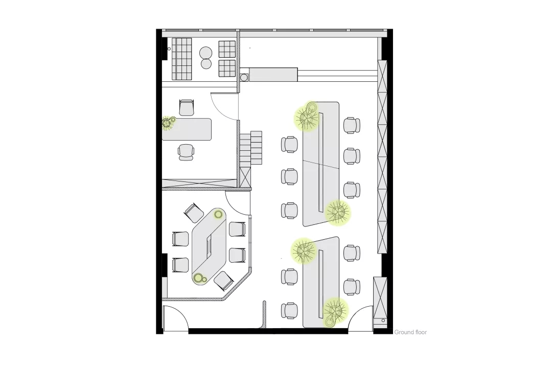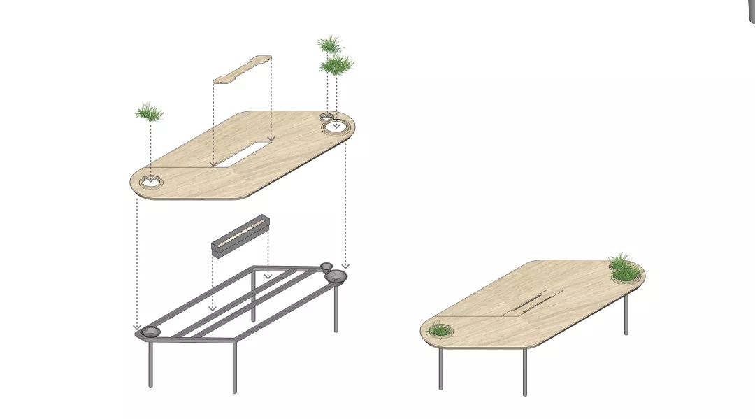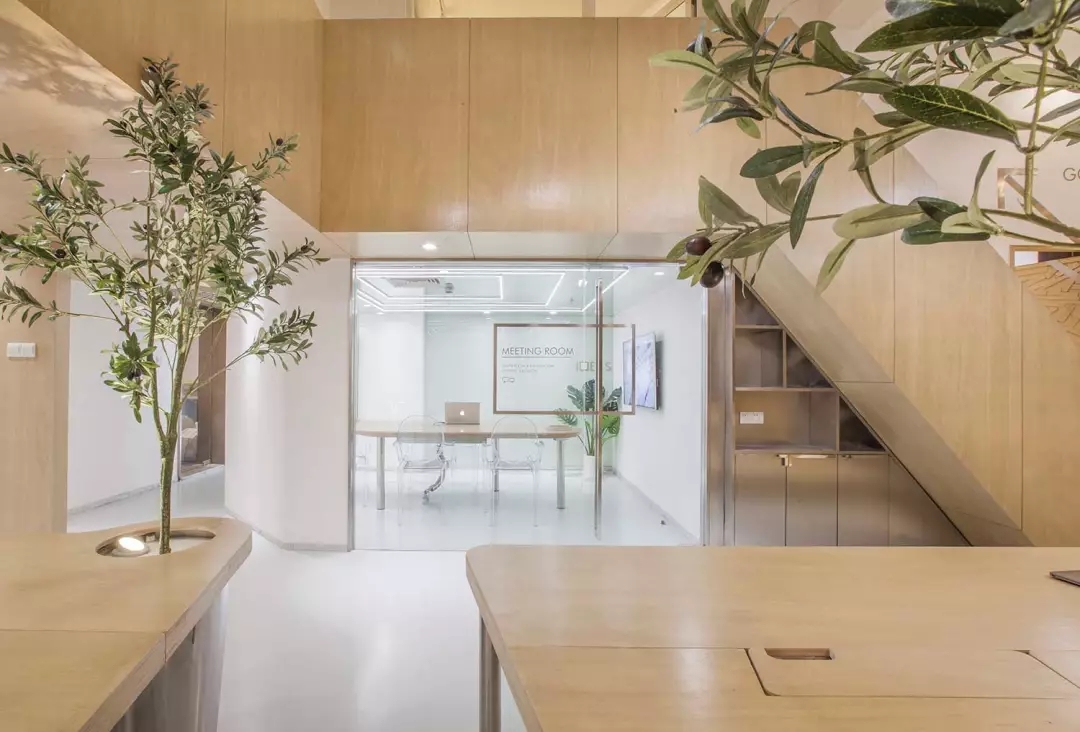 同時(shí)我們希望有一個(gè)張別具一格的會(huì)議桌,但是會(huì)議桌極強(qiáng)的功能性使得難以去進(jìn)行改變。于是,會(huì)議室空間本身的形狀缺陷成了這張桌子想法的起點(diǎn)。由于避讓入口玄關(guān),會(huì)議室空間有一個(gè)角是切掉的,墻壁是斜著放置,如果是長(zhǎng)方形的會(huì)議桌,就必然在這個(gè)斜墻前造成使用空間不夠缺陷,無法坐人.所以就產(chǎn)生了一個(gè)平行四邊形的會(huì)議桌,斜邊與空間的斜墻平行,也讓整個(gè)斜墻前的空間可以坐下一個(gè)參會(huì)者,再嵌入一些小草,一張獨(dú)特又實(shí)用的會(huì)議桌就出來了。
