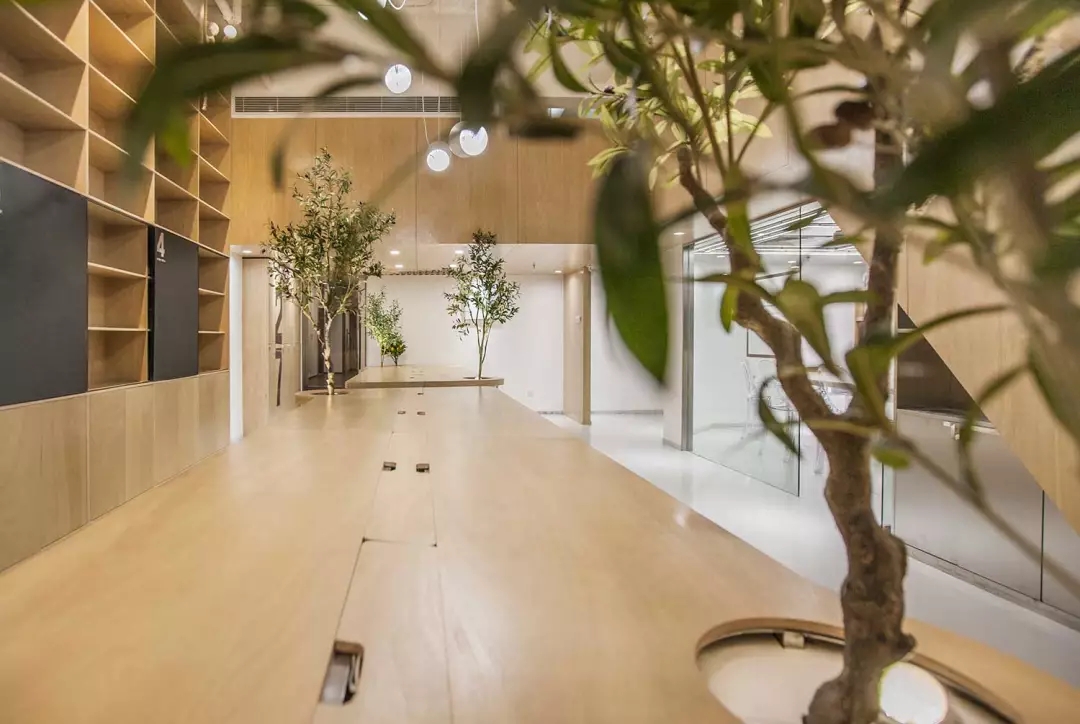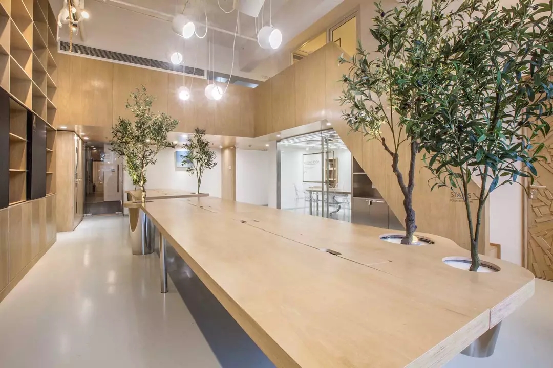 辦公桌與樹的結(jié)合,成為了整個(gè)空間的內(nèi)景觀,也與外面的綠色形成呼應(yīng),消減以往辦公的緊張氛圍。整墻的書架也不甘無趣,在實(shí)用的框架下,產(chǎn)生一絲波動(dòng)的起伏,如同山崖,如同坡面。