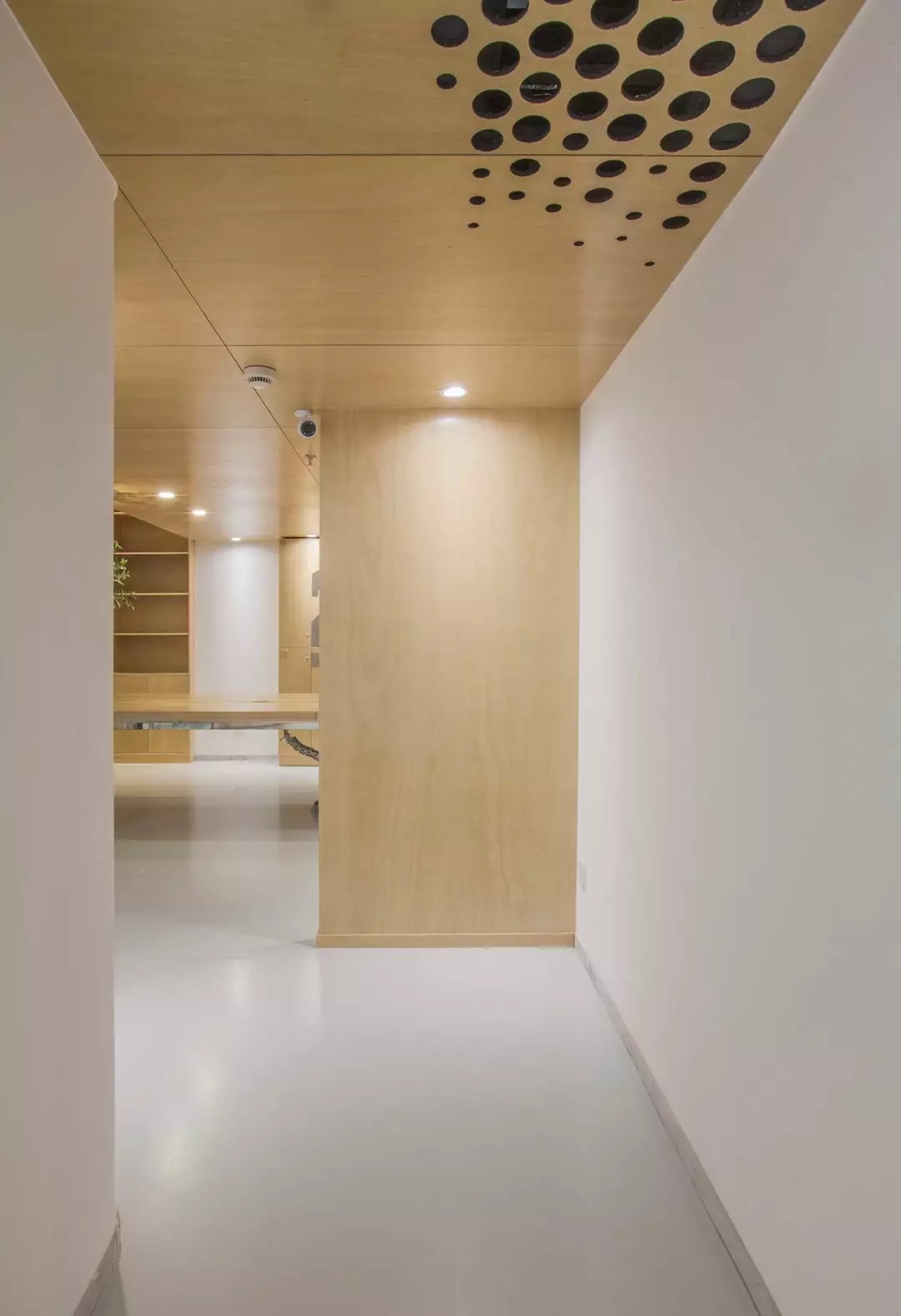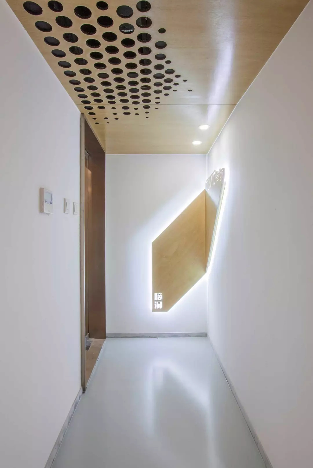 功能融于樂趣與創(chuàng)意,兩個(gè)空調(diào)的回風(fēng)孔也不能放過,市面上的百葉口為了實(shí)用而完全無法融入環(huán)境。由于吊頂也屬于木質(zhì)體塊,所以經(jīng)過試驗(yàn),一個(gè)充滿漸變的點(diǎn)陣圖形,解決了這個(gè)問題,不同規(guī)格的開孔器進(jìn)過精心布置并開洞,讓空間回歸純粹與樂趣。