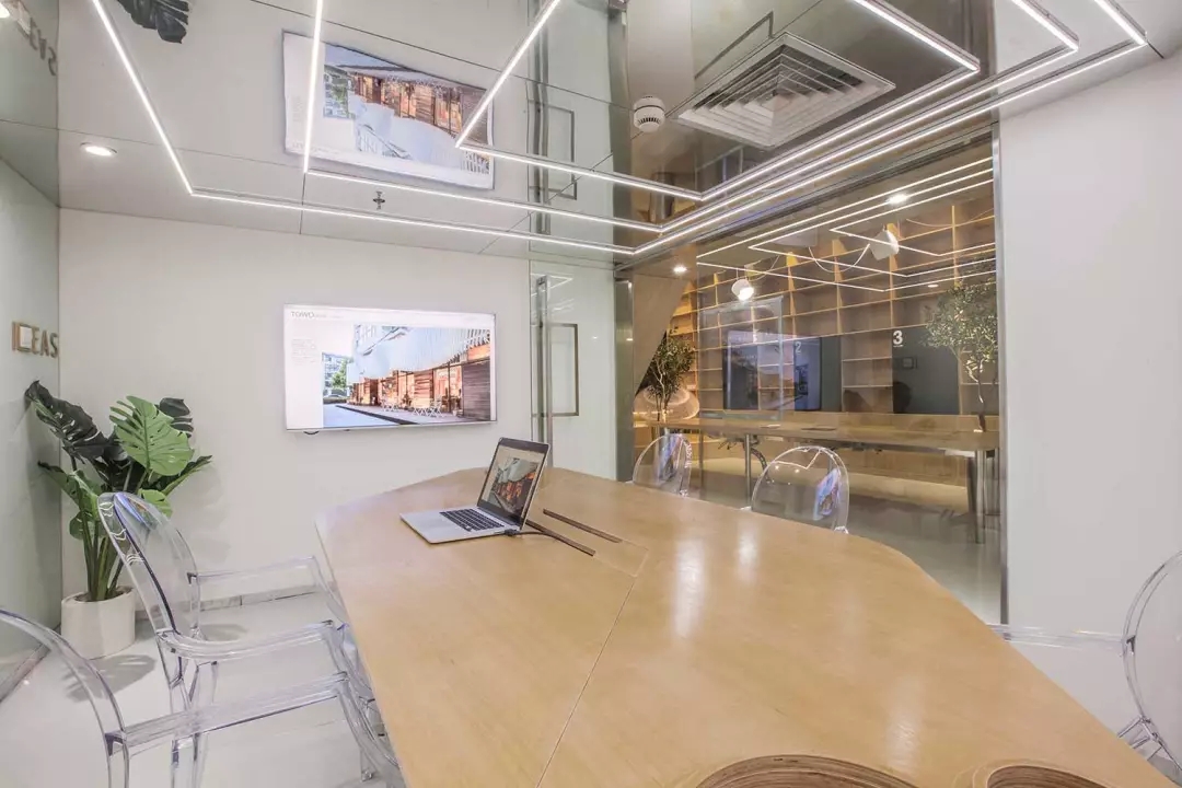 由于層高的限制,會(huì)議室感覺比較壓抑,所以將整個(gè)天花變?yōu)殓R面,化解的層高的局限,也讓空間感別具一格.但是空調(diào)的出風(fēng)散流器非常扎眼,空調(diào)的位置決定了風(fēng)口位置無法移動(dòng)。而市面上又找不來合適的可以符號(hào)化的替代品,于是,就順勢(shì)而為,將會(huì)議室的照明以散流器為中心進(jìn)行布置,讓散流器的方框與燈光呼應(yīng)起來,形成了會(huì)議室有意思的圖形。