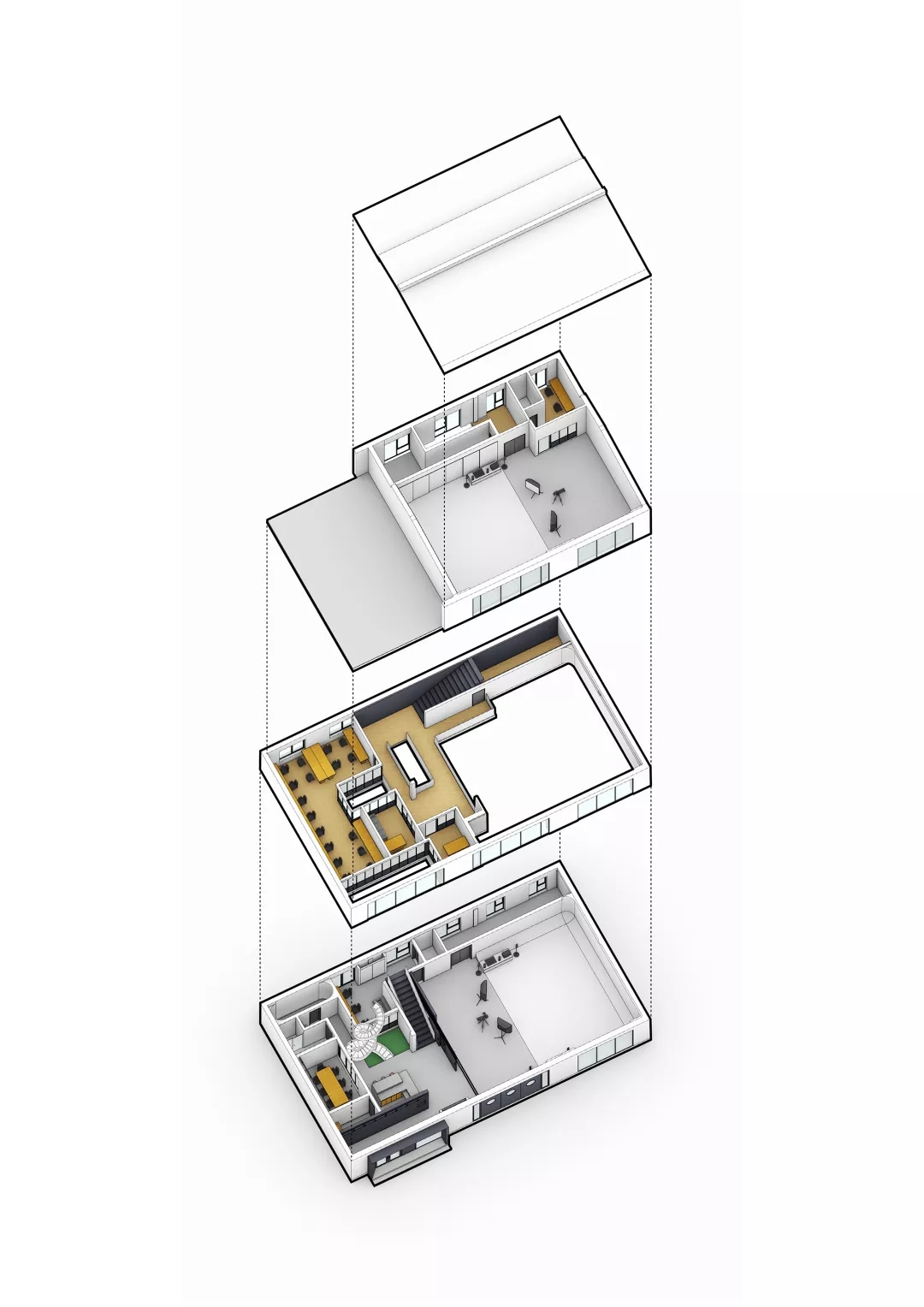 ASTUDIO攝影工作室是一個(gè)多功能的復(fù)合空間,UUA把拍攝、化妝、接待、辦公、會(huì)議、休閑等多種功能有機(jī)地融合在這個(gè)通高的廠房之中,空間緊湊又富于變化。拍攝區(qū)為最重要的功能單元,由于需要足夠的長(zhǎng)寬高空間來滿足設(shè)置無影墻、布景布光以及拍攝距離等需求,所以設(shè)計(jì)師將一層的一半劃歸為1號(hào)拍攝區(qū),保留雙層通高的空間形式;另一半則加建出雙層空間,其中一層作為接待,二層作為辦公。廠房的三層因?yàn)樵揪哂凶銐虻膶痈撸虼吮辉O(shè)置為2號(hào)拍攝區(qū)。