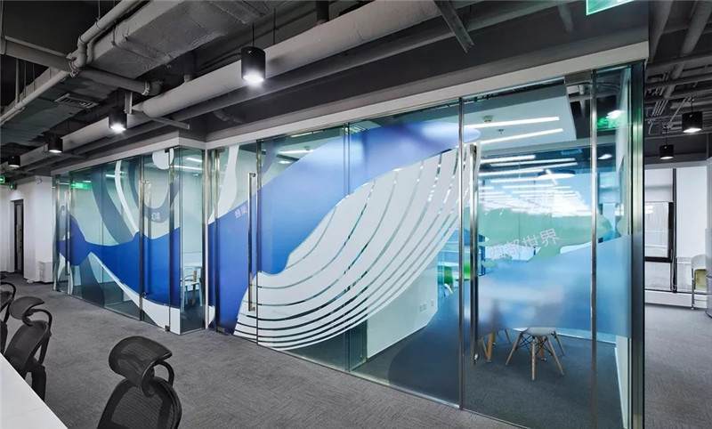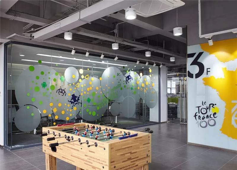 第二張中可以看到,桌上足球,這一張是會議室的玻璃貼膜,最初設計的都是一些彩色的圓點,但是做完后太通透,起不到遮擋作用,所以現(xiàn)場臨時在玻璃的內(nèi)側又加了大型的磨砂圓,就有兩層疊加到一起的圖形,磨砂與色彩組合在一起,效果豐富有層次。