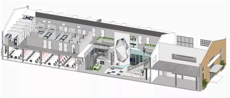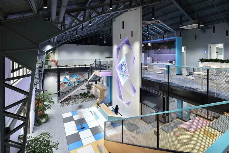 本案位于上海市寶山區(qū)蘊川路6號智慧灣科創(chuàng)園,原建筑為3D打印的廠房裝修,室內(nèi)最高凈高9米,最低6.4米。此空間除原建筑結(jié)構(gòu)墻外,無任何結(jié)構(gòu)柱與墻體,因此為了更充分合理的利用空間,設(shè)計師構(gòu)筑了二層,根據(jù)嗶哩嗶哩電競的辦公功能訴求,布置空間功能區(qū),即1F分布前臺區(qū)、會議區(qū)、茶水接待區(qū)、賽訓(xùn)室、開敞辦公區(qū)、導(dǎo)播室。2F分布就餐區(qū)、住宿區(qū)、導(dǎo)播室等空間。