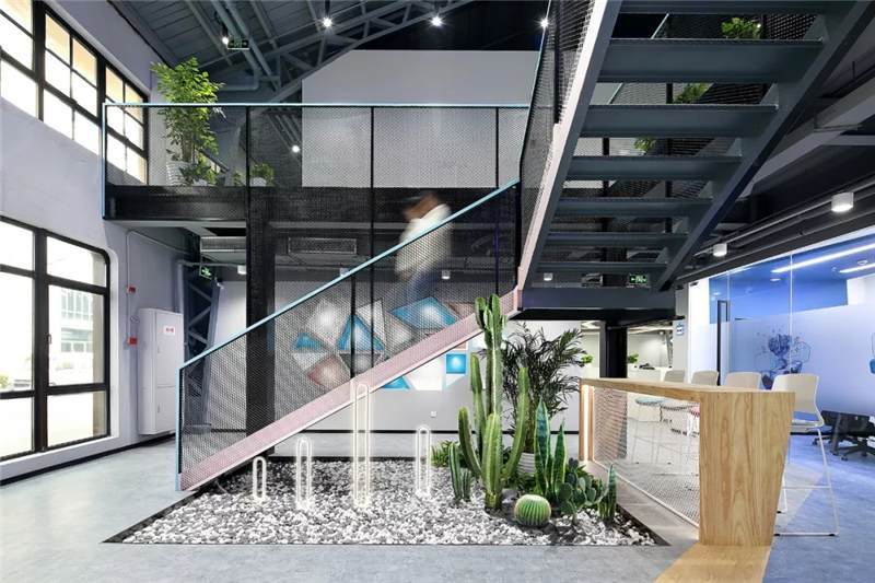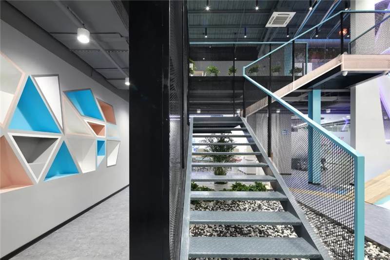前廳左側(cè),設(shè)計結(jié)構(gòu)簡單的樓梯,運用與二層欄桿材質(zhì)相同的鐵絲網(wǎng)扶手,使得兩層樓形成一個工業(yè)風(fēng)的整體。側(cè)邊與扶手點綴以藍色和粉色的噴漆,樓梯下布置用鵝卵石,仙人掌和燈光組成的景觀裝置小品,讓整個電競空間生機勃勃,平添許多年輕活躍的氛圍。此處木飾面的吧臺延伸到地面再與前臺、右側(cè)大臺階連接形成一個整體,使整個空間更加連貫統(tǒng)一。