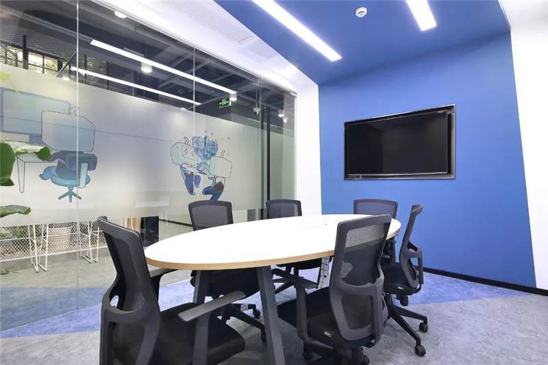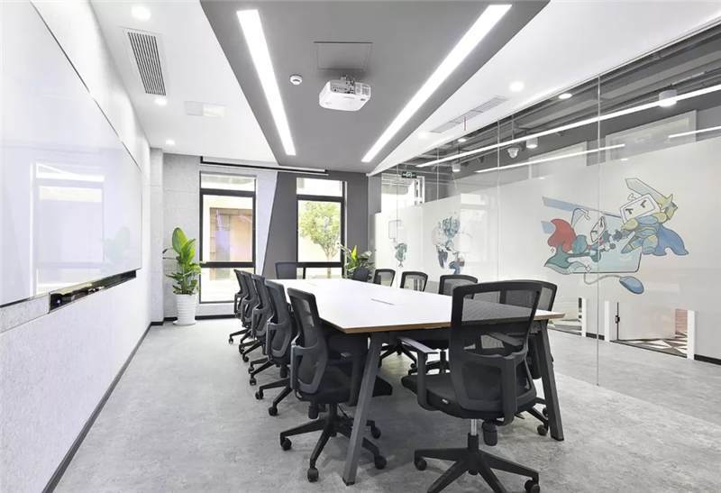 開放辦公區(qū)主體用大量的白色,更加干凈、簡潔;頂面燈具使用粉色,與其他區(qū)域相呼應(yīng);地面采用兩種地膠拼接,也使得空間更加有層次感。大小不同的會議空間設(shè)計,運用了天花到墻面再到地面的連貫造型,增加整個會議空間的靈活性。