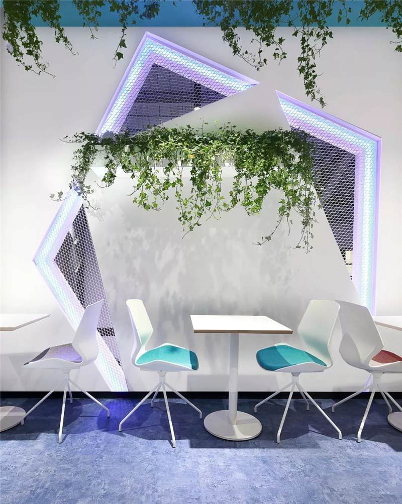 前臺接待區(qū)利用建筑結(jié)構(gòu)挑空空間的優(yōu)勢,塑造9米高的具有未來雕塑造型藝術(shù)感的LOGO背景墻,結(jié)構(gòu)形態(tài)上,設(shè)計師運用B站文化中的創(chuàng)意與元素,中間由三維立體幾何造型與鐵絲網(wǎng)拼接而成,配以藍色燈光,彰顯公司文化的同時呈現(xiàn)電競的科技感,使得整體背景墻,體量和形態(tài)上給往來訪客和員工強烈的視覺沖擊感。