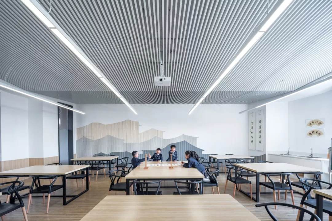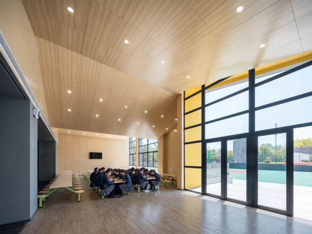 與此同時(shí),為了整體打造校園環(huán)境,設(shè)計(jì)從空間結(jié)構(gòu)、人造物與自然物的角度出發(fā),將建筑、室內(nèi)和景觀融合在一起,達(dá)到一種“浸潤(rùn)式”的教學(xué)空間體驗(yàn)。