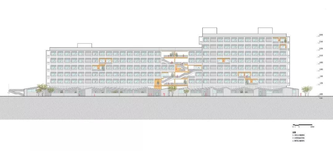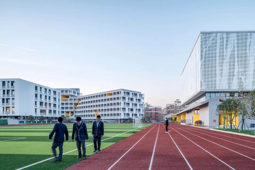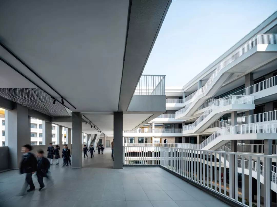 整個(gè)學(xué)校的概念策略、空間形態(tài)和場(chǎng)所定義描繪了一副全新生動(dòng)的體驗(yàn)式教學(xué)圖景,設(shè)計(jì)作為實(shí)現(xiàn)的媒介為義烏新世紀(jì)外國(guó)語學(xué)校的師生提供了更多的教育體驗(yàn)和可能性。而貫穿其中的設(shè)計(jì)聚焦點(diǎn):教育類空間在城市高密度環(huán)境中的微妙立場(chǎng)、國(guó)際化教學(xué)體系與傳統(tǒng)國(guó)學(xué)文化兼容并重的有機(jī)教學(xué)空間建筑空間、面向未來的傳統(tǒng)空間體驗(yàn)營(yíng)造,也是飛速城市化進(jìn)程中的中國(guó)所普遍面臨的問題,更是零壹城市一直以來并且會(huì)持續(xù)關(guān)注的高密度城市與教育空間問題的研究點(diǎn)。