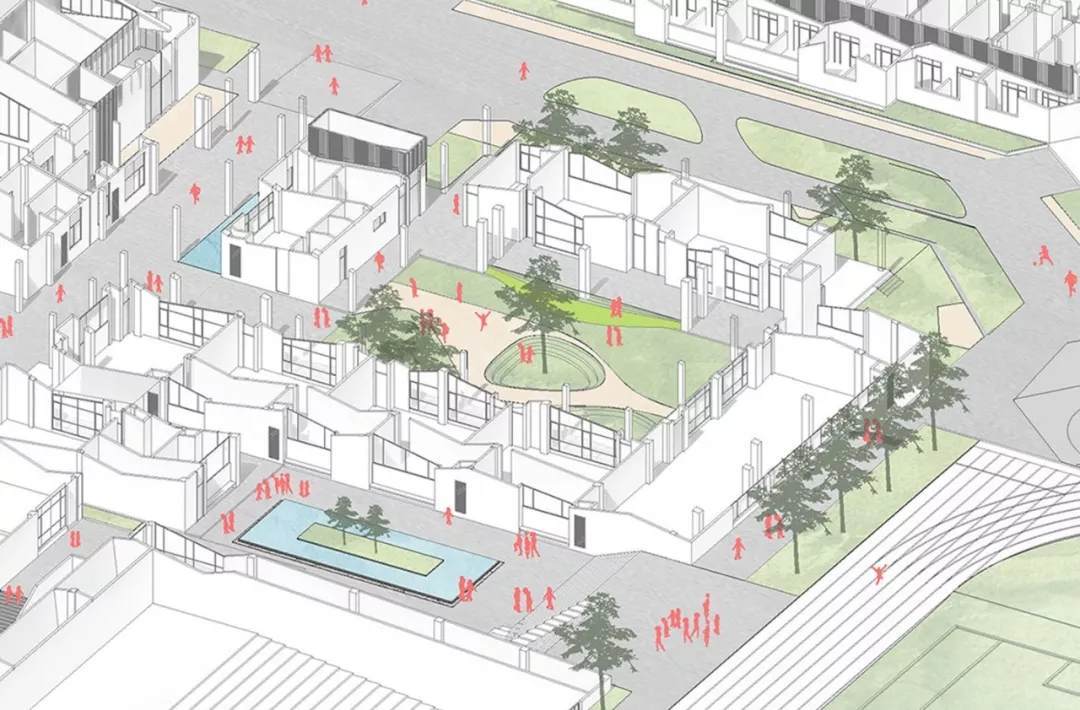 為此,校園中的教育活動(dòng)場(chǎng)所不應(yīng)僅著眼于教室,而是以城市規(guī)劃的視野作為出發(fā)點(diǎn)。校園首層的建筑形態(tài)以當(dāng)?shù)亟纤l(xiāng)的坡屋頂建筑為原型進(jìn)行排列組合,并置入了“街道”、“巷弄”、“院子”、“口袋公園”等有趣友好的場(chǎng)所,強(qiáng)化校園的“社區(qū)感”,“大街小巷”之間互相連通,并連接著一個(gè)個(gè)小而美、小而親的場(chǎng)所,生態(tài)開放,恬靜安逸,為孩子們帶來“浸潤(rùn)式”的教學(xué)空間體驗(yàn),引發(fā)孩子們互動(dòng)玩耍、學(xué)習(xí)交流的熱情。