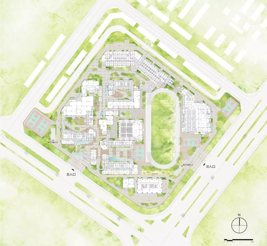 整個(gè)校園場(chǎng)地是一個(gè)呈45度朝向的矩形,建筑密度達(dá)到1.4,遠(yuǎn)超0.8的平均標(biāo)準(zhǔn),場(chǎng)地空間利用非常緊張。如此高密度環(huán)境下的校園建筑規(guī)劃設(shè)計(jì),是一場(chǎng)空間的游戲也是一道數(shù)學(xué)題:通過規(guī)劃的布局最終滿足一個(gè)容積率的等式。解開這道“數(shù)學(xué)題”的同時(shí)又能滿足校園親切舒適的尺度成為了規(guī)劃的核心問題。
