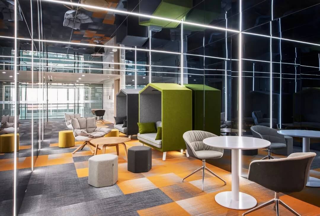 在軟裝設計上,該區(qū)域家具軟裝及墻壁,選擇明快的色調(diào),展示青春活力,并且用黑色烤漆玻璃內(nèi)嵌燈帶的方式營造氛圍,透著數(shù)字化和科技感,表現(xiàn)商湯在數(shù)字時代的不同場景中,所呈現(xiàn)的多元化和創(chuàng)新性。