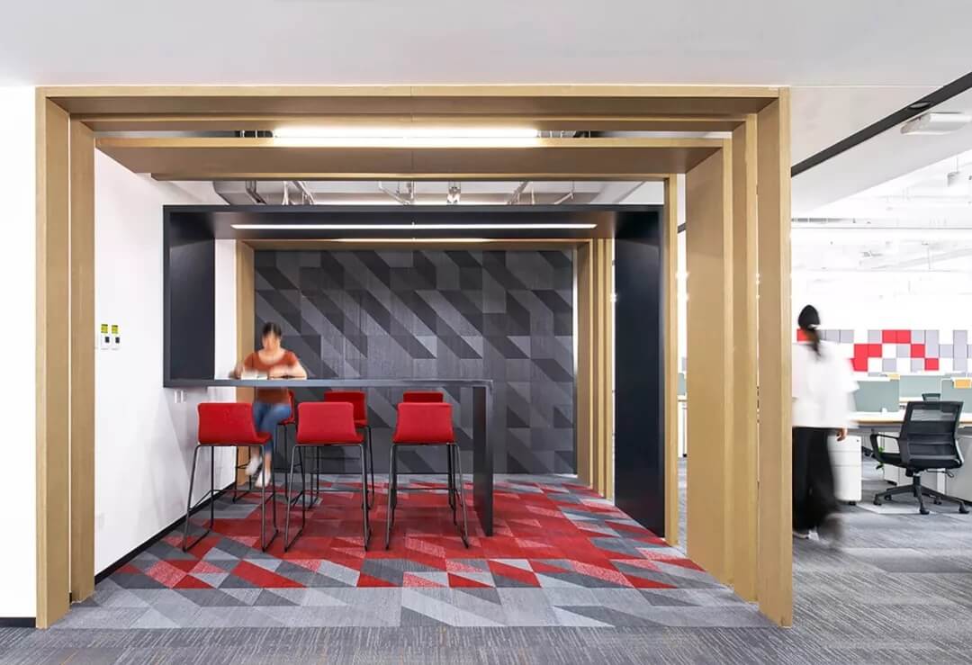 核心筒是整個辦公空間的混合功能區(qū),頻繁產(chǎn)生互動式交流,頭腦風暴,也是重要的會客及自由移動式辦公區(qū)。在設計上,艾迪爾設置了滿足不同會客需求的休閑討論區(qū),連接著標準辦公區(qū)和公共通道,營造多層次交流氛圍,體現(xiàn)商湯科技開放包容的文化價值觀。