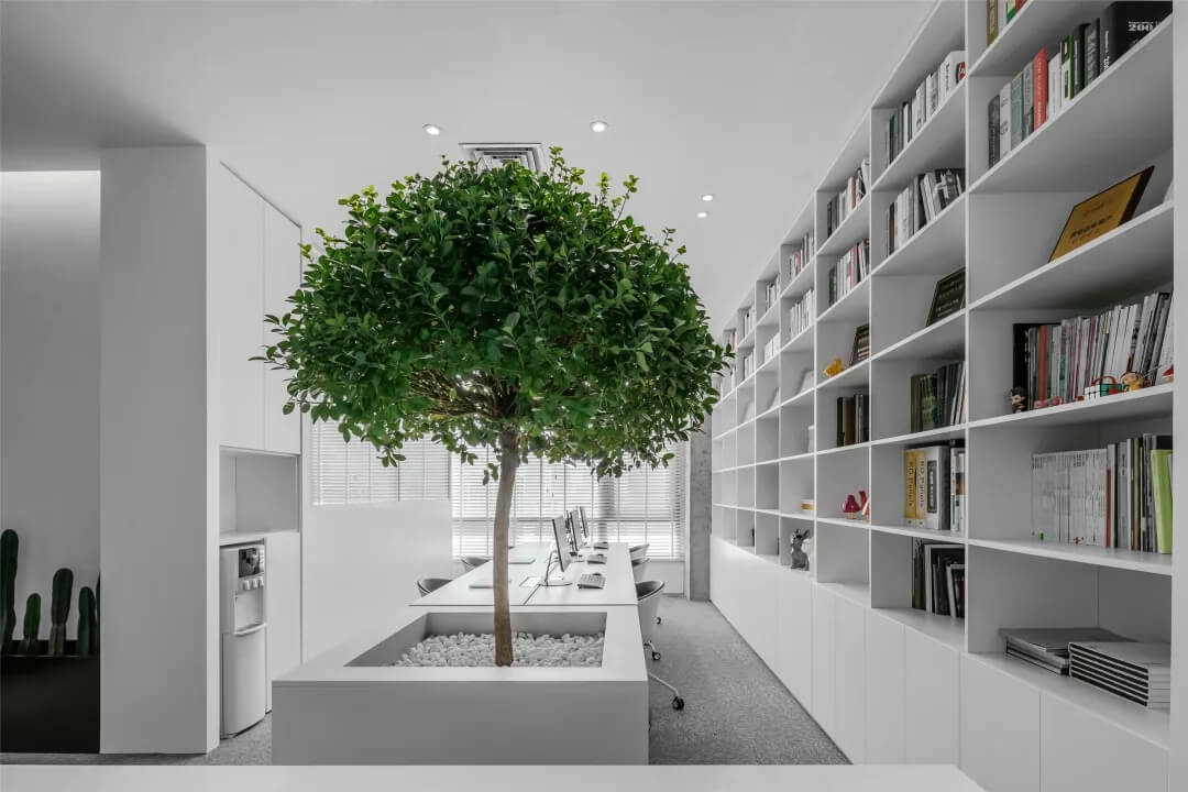 觸覺設(shè)計巧妙擷取文化于當(dāng)代都會空間,展現(xiàn)出雅致韻味的同時留下了更多觸碰的余地。綠植來點亮辦公場所的鮮活生命力,清逸的色彩是思想游龍的軌跡,在留白的空間中伸出觸角,觸覺所及之處,思維綻放遐想。