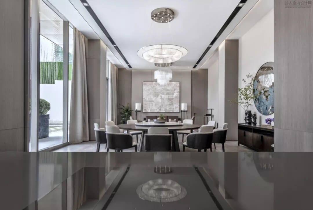 私宴,是以當(dāng)代設(shè)計(jì)來(lái)描繪文人飲酒時(shí)追求的清雅意境,寄情於山水??臻g通過(guò)折疊門(mén)和西廚吧臺(tái)區(qū)產(chǎn)生互動(dòng),空間功能既獨(dú)立又有相互滲透。延續(xù)簡(jiǎn)潔流暢的線條,布置與空間密切配合。