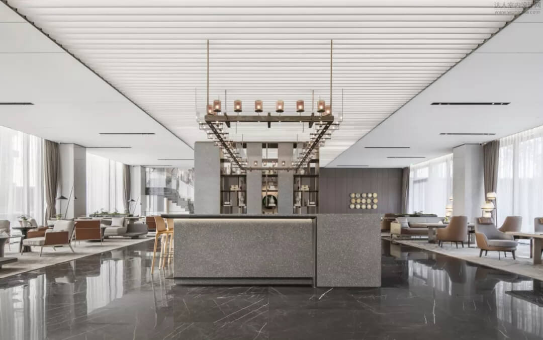 通過(guò)豐富的景觀區(qū)進(jìn)入門(mén)廳,感受到空間的空靈,立面設(shè)計(jì)過(guò)濾了來(lái)自于外界的繁復(fù)。十米挑空的大廳,墻面以米色砂巖為基底,黃銅色金屬?gòu)?qiáng)化縱向的比例,凸顯出空間的氣勢(shì)。入口對(duì)景設(shè)置的水景讓穿梭其中的訪客仿若能傾聽(tīng)到潺潺水聲,同時(shí)水景和懸掛的軟裝裝置相得益彰,充滿巧妙的用意,同時(shí)也分隔了挑高通透的玻璃幕墻,虛實(shí)結(jié)合,體現(xiàn)現(xiàn)代設(shè)計(jì)的東方神韻。