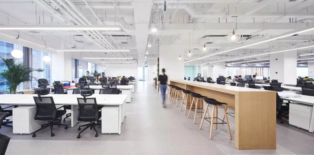 設計師在開放式的辦公區(qū)域設置長條吧臺桌,供員工自由討論辦公,午間用餐等,同時開放辦公區(qū)與南側(cè)公共島空間相連,員工可攜帶筆記本在這里沐浴著陽光辦公,討論,商務洽談,休憩等。