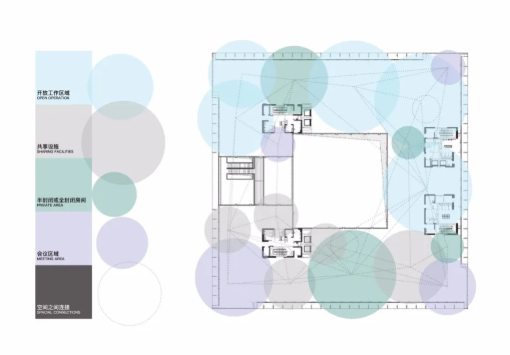 該項(xiàng)目的另一個(gè)重要的設(shè)計(jì)出發(fā)點(diǎn)是設(shè)計(jì)師期望將上海這個(gè)城市的活力與多樣性引入并轉(zhuǎn)化為工作空間的功能分布,因此,整個(gè)辦公室中從任意工位出發(fā)走到就近洽談