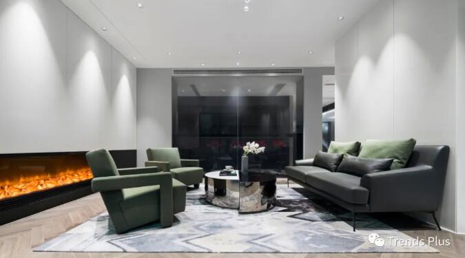 翡翠林梢青黛山,碧紗窗外水挪藍(lán),淺色的空間融入灰綠色的軟裝,建筑與室內(nèi)的氣質(zhì)彌漫開來。定制的麂皮絨沙發(fā),鏡面金屬和白色石材拼接而成的茶幾,藝術(shù)感彰顯無遺。黑色漸變玻璃隔墻,既是背景墻又是空間顏色最深的立面,讓茶水間在保持通透的同時(shí)又保證會(huì)客區(qū)客人的私密性。壁爐,火焰,回歸自然的同時(shí)讓氛圍變得輕緩,香茗與咖啡,讓辦公空間散發(fā)著靈魂的香氣。