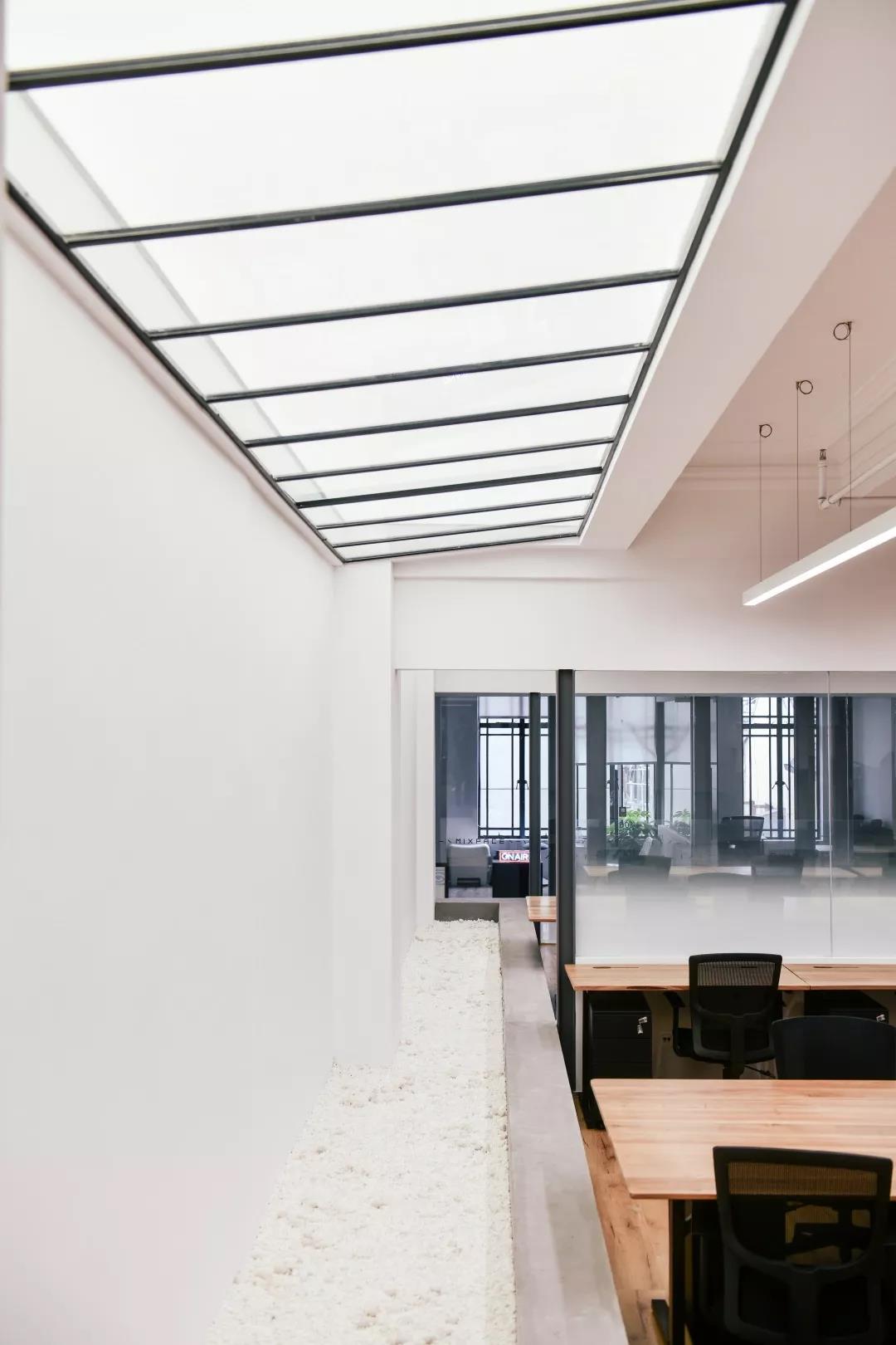 總共三層的空間由于老建筑既有格局的影響,采光較差,我們?cè)谟邢薜拿娣e中挖出一個(gè)中庭,同時(shí)利用原有的破損樓板創(chuàng)造了若干“天窗”,巧妙地使用照明來創(chuàng)造光亮,消解歷史建筑本身的體量和沉重感。因此,從略顯晦暗、滄桑的歷史建筑走進(jìn)辦公空間是一種如釋重負(fù)的輕快和光明。