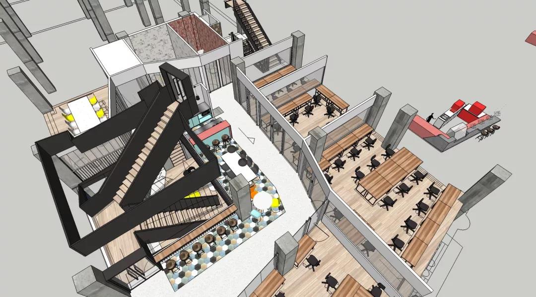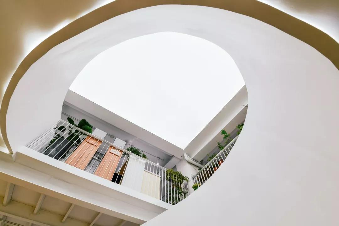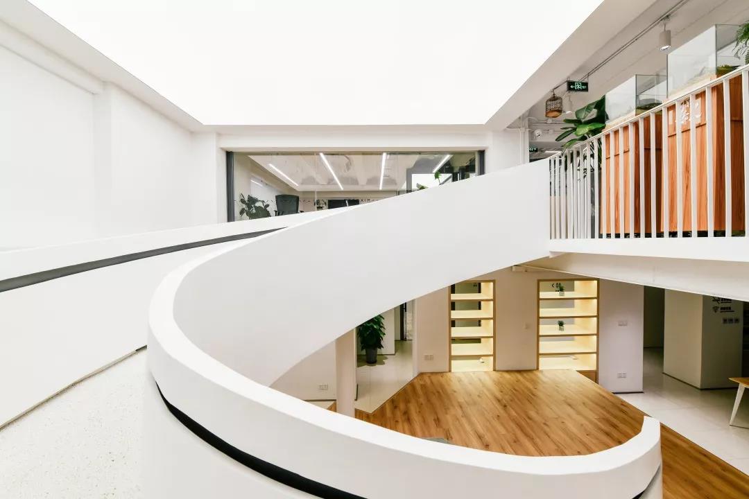 整個(gè)空間最大的視覺中心便是中庭里那個(gè)“刻意”彰顯存在感的樓梯,優(yōu)美的弧線激發(fā)并引導(dǎo)著大家探索上層空間的欲望。在最初的方案中,它其實(shí)并不是曲線,而是剛毅的直線,我們認(rèn)為直線的迷人在于它的簡(jiǎn)單、坦誠(chéng),棱角分明且封閉的做法讓它如雕塑一般矗立。