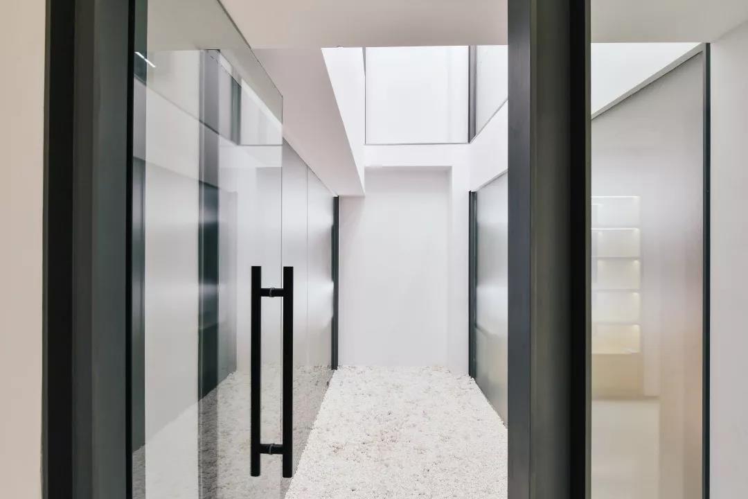 出于功能的需要,我們不得不在空間中加入隔墻,但為了讓老房子的肌理更加清晰,隔墻在與天花線腳的交界處切割為線腳的形狀,令原有天花線腳在視覺上保持連續(xù)。新置入的墻也一再被簡(jiǎn)化,只有片段的玻璃、白墻、鋼柱直接裝在舊有構(gòu)筑上。同時(shí),為了盡可能減少干擾視覺的繁瑣因素,我們對(duì)細(xì)節(jié)反復(fù)推敲,讓每一處純粹到極致。