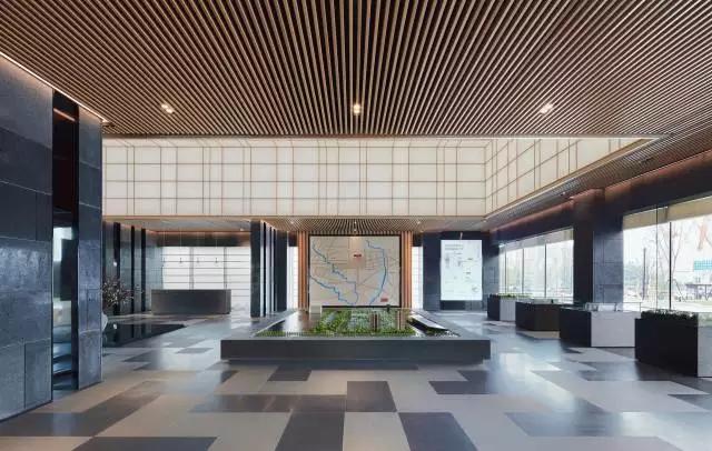 步入大廳,通過“借景”手法,將頗具詩情畫意的東方園林之景鋪呈在眼前,一抹翠綠更是讓整個(gè)空間靈動(dòng)起來,巧妙而又極具視覺沖擊。在陽光照射下,投影又成為景觀的一部分,展示出自然與建筑的互動(dòng),活躍且適宜。一大排落地窗串聯(lián)起室內(nèi)外關(guān)系,正是光線的引入,讓建筑、景觀、室內(nèi)形成有序的一體。沿著預(yù)接待吧臺(tái)的動(dòng)線向前穿引,便是整個(gè)銷控區(qū)域。