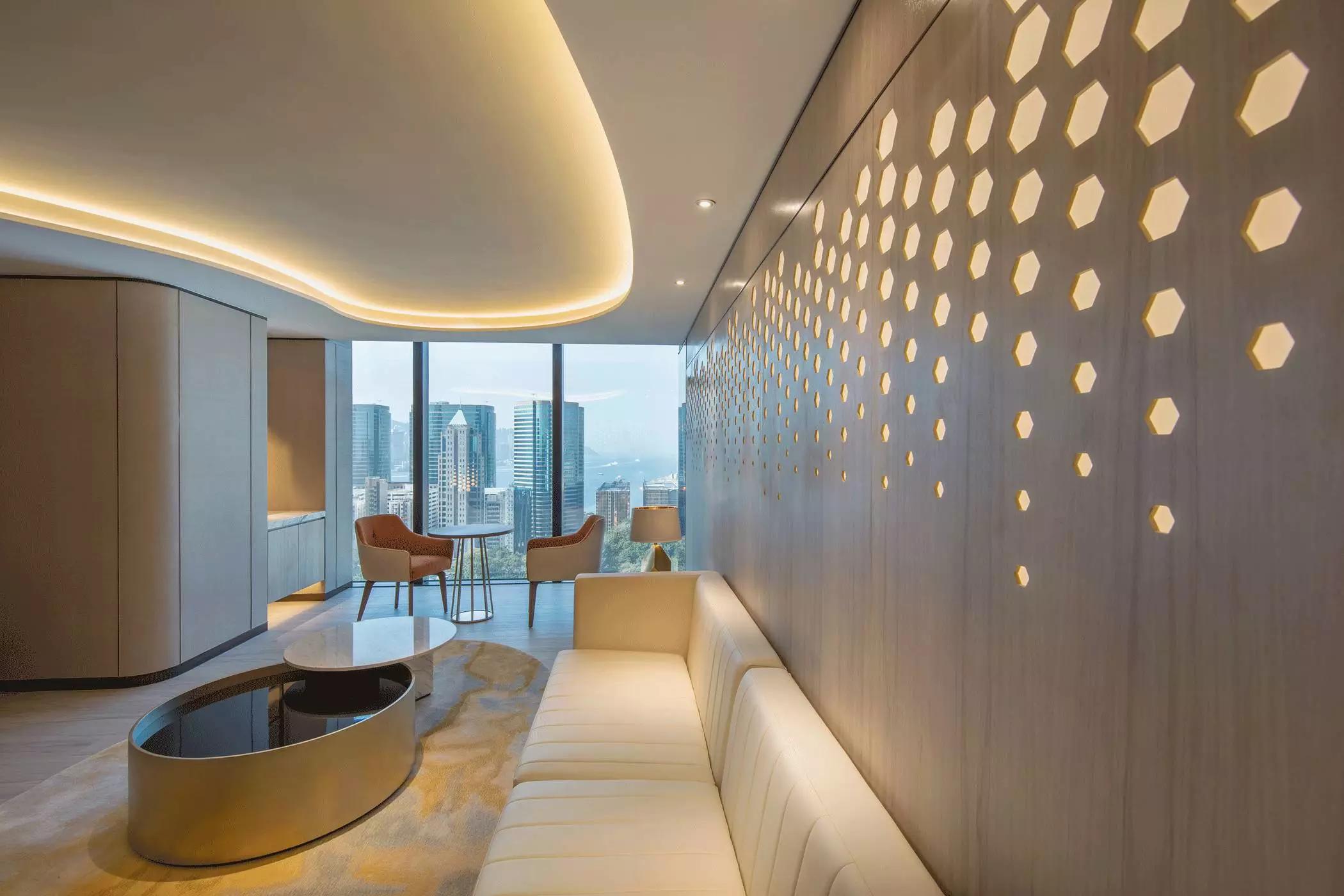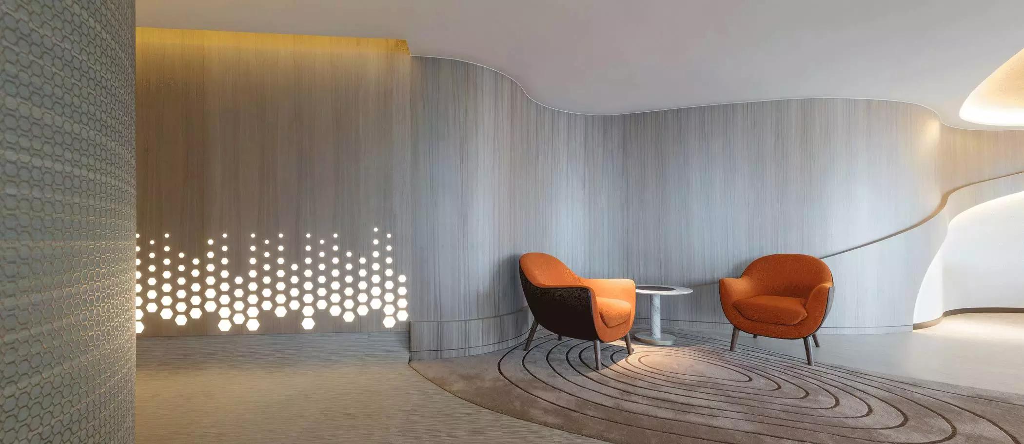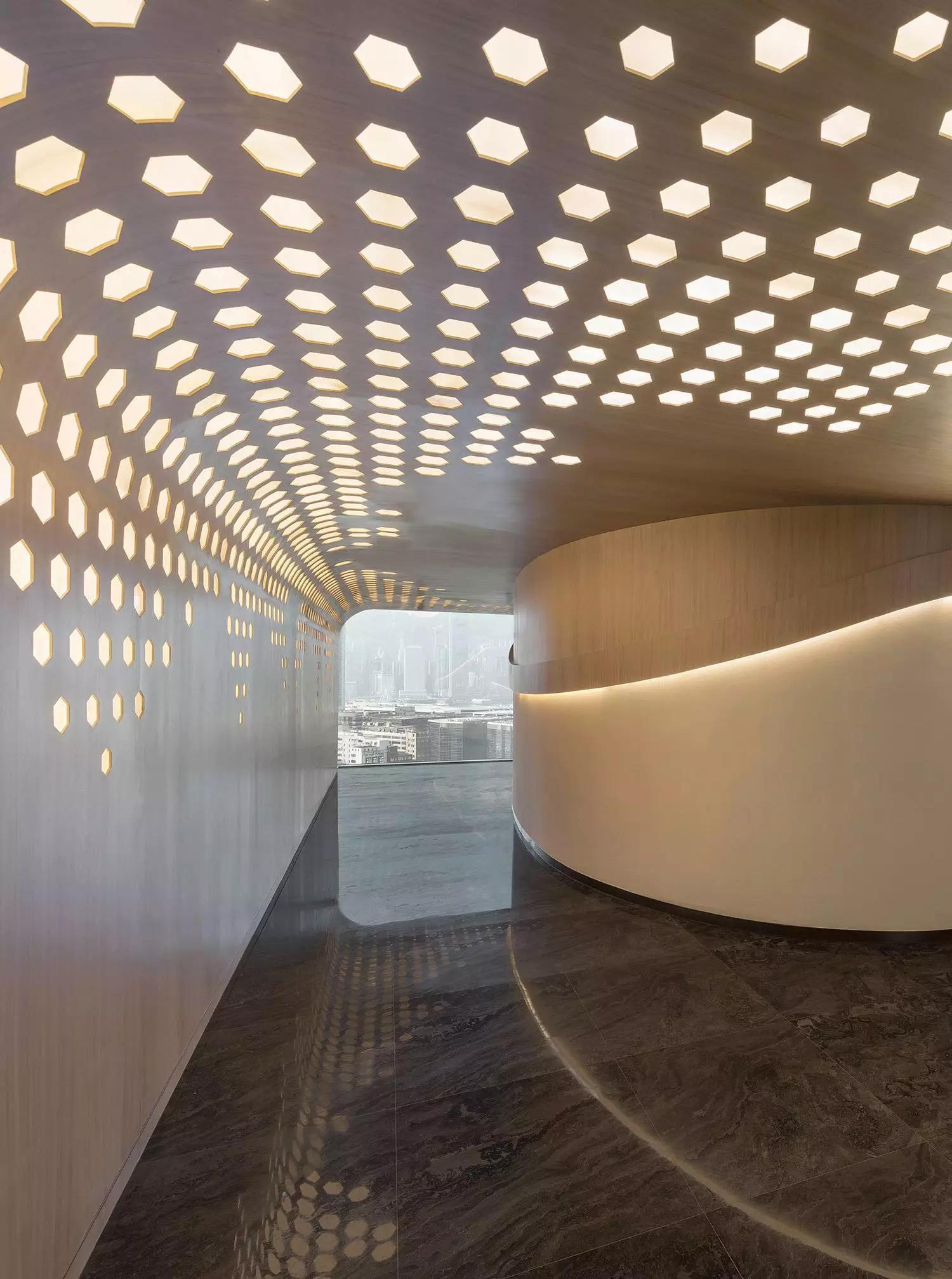 蜂窩形狀滲進(jìn)天花至墻身的燈箱以及屏風(fēng),體現(xiàn)出大自然的親和力讓人心沈靜,宛若森林小徑,葉縫間穿過而灑落的陽(yáng)光,體現(xiàn)日本韻文中的「Komorebi」靜謐而悠閑涵蘊(yùn)希望。