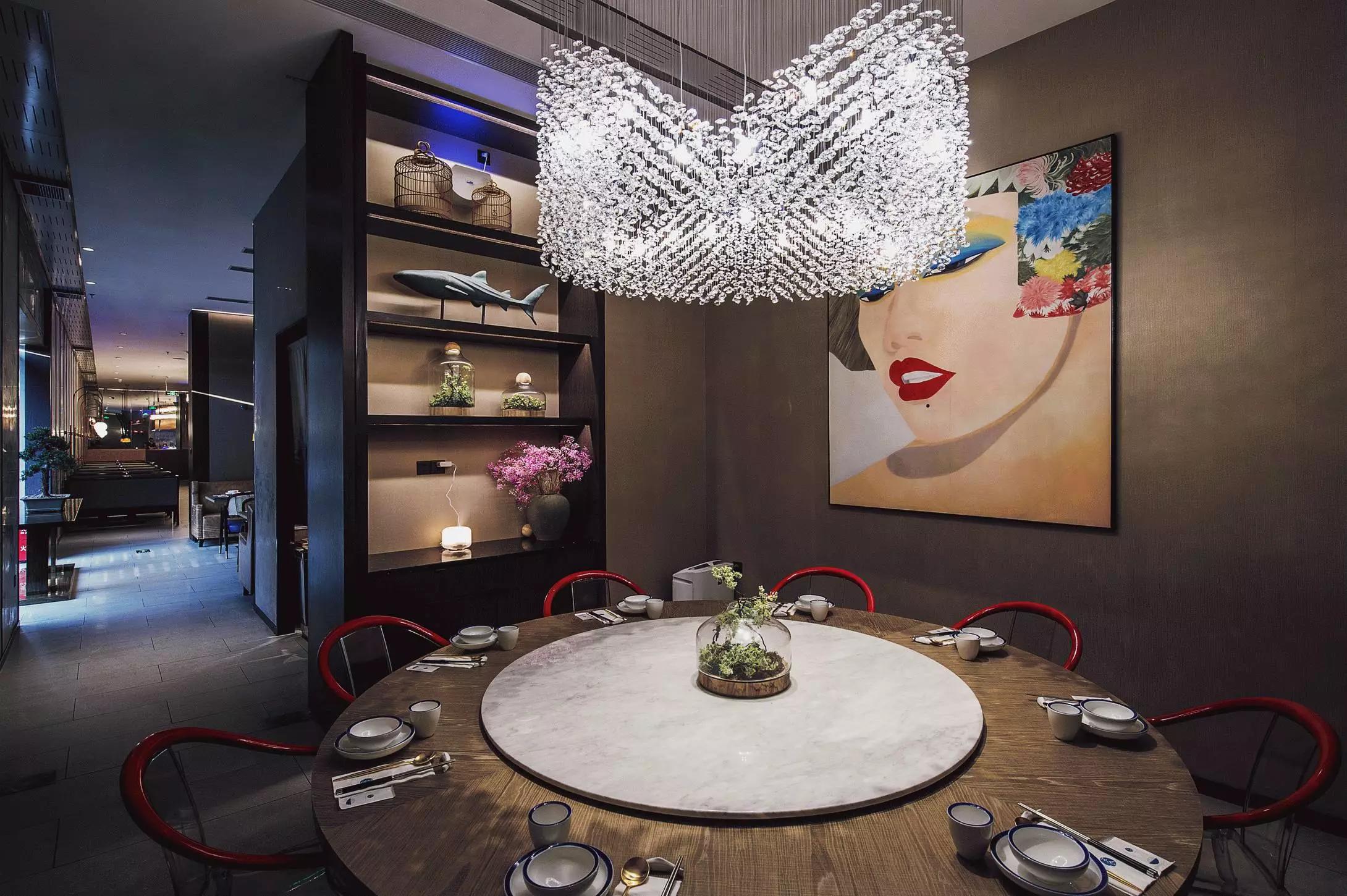 用餐區(qū)完全是一個開放的空間,沒有很多的隔斷,圓桌和方桌有序排布,既充分利用了空間又避免了單調(diào),結(jié)合燈具的設計,就像在老家庭院里的大家庭聚餐——夜晚,歸來的親人們,在清涼的月色中,你來我往,和和樂樂,傳遞此間。